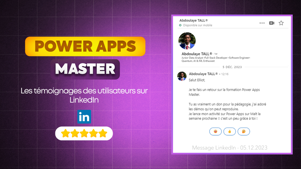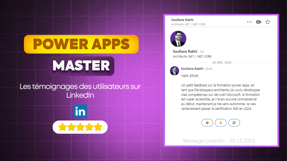 🗣️ "C'est une très bonne formation avec une organisation de vidéo très pratique. Les explications et les visuels sont très claires. On a un beau panel de fonctions, capacités utiles, et indispensables avec les démos correspondantes." Yannick | Responsable IT chez Airbus🗣️ "Elliott est indéniablement l'expert Français de Power Apps, en tant que développeur/architecte j'ai voulu développer mes compétences sur cet outil, je suivais Elliott sur Youtube. Je me sens maintenant autonome et mes clients sont ravis." - Soufiane | Consultant chez CapgeminiLes témoignages des clients ayant participés à la MasterClass Power Apps Master